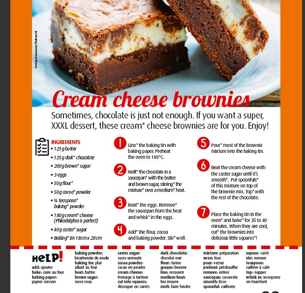 - Une nouvelle recette gourmande en anglais : le ‘cream cheese brownie’ (attention les calories : prévoir de faire double dose de séance de sport en anglais juste après !)