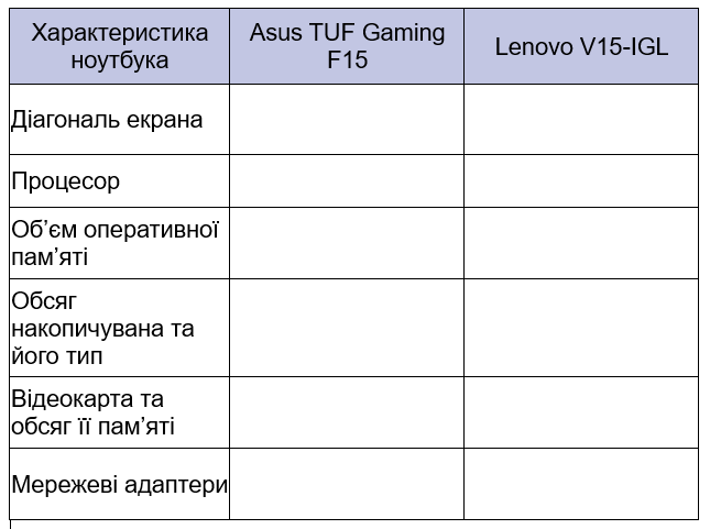 Створити порівняльну таблицю для двох ноутбуків і написати висновок. Використовуючи мережу Інтернет, знайти відповіді на запитання та вставити їх у таблицю.