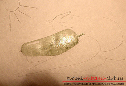 Для цього беремо один елемент малюнка і за допомогою мокрої пензлика воложимо його. На нашому малюнку першим елементом для малювання став огірок. Тепер набираємо дуже світлу зелену фарбу на пензлик і наносимо її на огірок. Запам'ятайте. Ми не будемо використовувати чисті колірні рішення. Для отримання того чи іншого кольору нам необхідно буде змішувати фарби між собою на підготовленої нами палітрі. Поки поверхню огірка мокра, ми її трошки затемнимо. Тільки обов'язково потрібно залишити невеликий відблиск на верхній ділянці овоча.