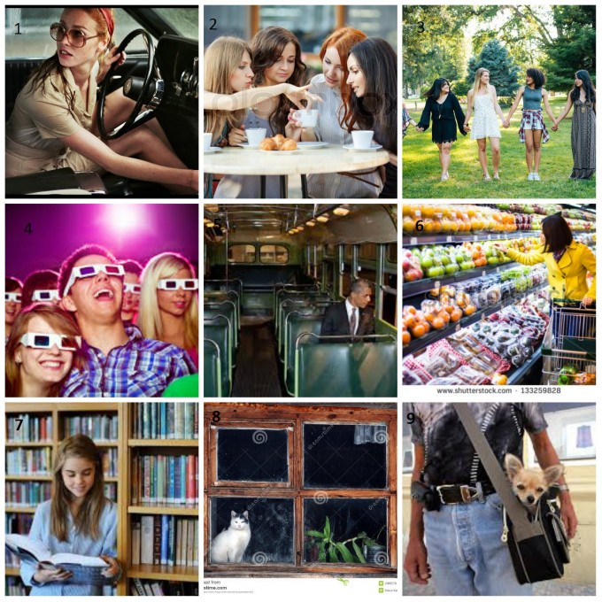 in the cafe, in the car, in the bus, in the librari, in the bag