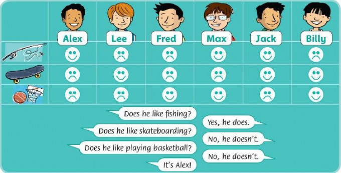 The student shows the word but without any sounds. Other students try to guess the word "You like reading books\ Yes, I do!"