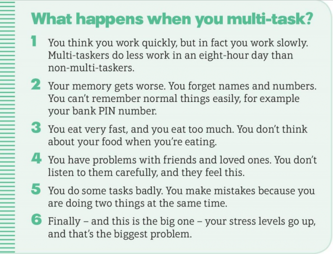Now change your partner. Student A thinks that multitasking is good, student B thinks that it's bad! Try to persuade your partner!